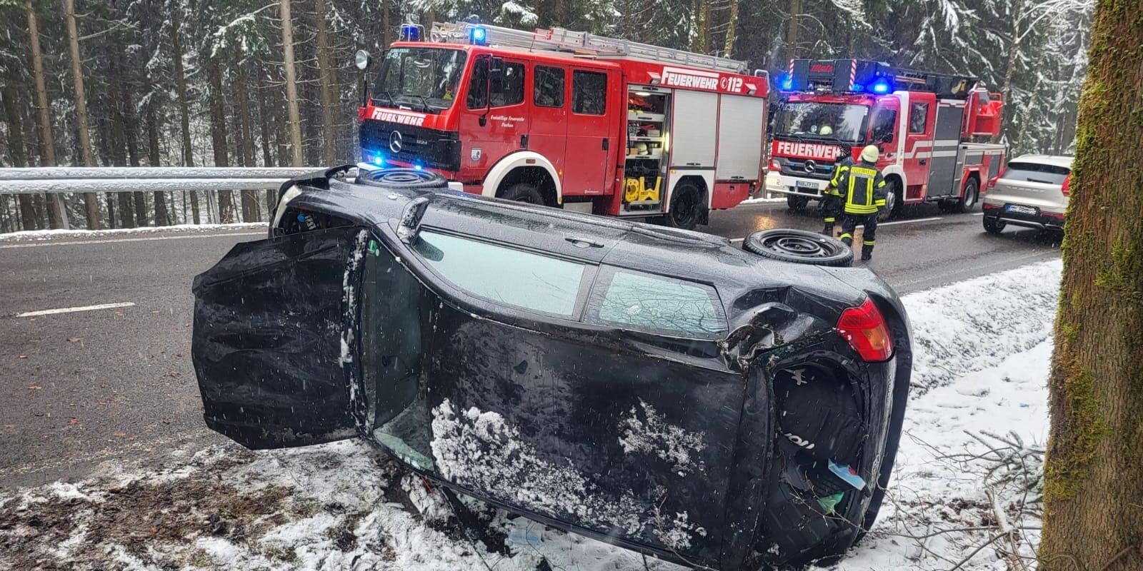 Die Freiwillige Feuerwehr Pockau wurde am Freitagabend zusammen mit der Feuerwehr Lengefeld zu einer Technischen Hilfeleistung mit dem Einsatzstichwort “PKW Überschlag” auf die Bundesstraße 101 zwischen Pockau und Kalkwerk alarmiert. Ein aus Richtung Kalkwerk kommender PKW kam hierbei in einer Rechtskurve von der Fahrbahn ab, stieß in den Straßengraben und blieb auf der Seite liegen. Der Fahrer konnte sein Fahrzeug glücklicherweise eigenständig verlassen, blieb nur leichtverletzt und befand sich bei Ankunft der Einsatzkräfte bereits zur medizinischen Versorgung im Rettungswagen. Die Batterie des verunfallten PKW wurde abgeklemmt, parallel dazu die Einsatzstelle abgesichert sowie der Brandschutz sichergestellt. Ebenso wurden auslaufende Betriebsmittel abgebunden und die Fahrbahn gereinigt. Anschließend wurde die Unfallstelle der Polizei übergeben, welche nun die Ermittlungen zum Unfallhergang auf nimmt. Die Lengefelder Wehr konnte ihren Einsatz noch auf der Anfahrt abbrechen. Die B101 war für ca. 30 Minuten voll gesperrt. Dem Verunfallten gilt eine schnelle Genesung.