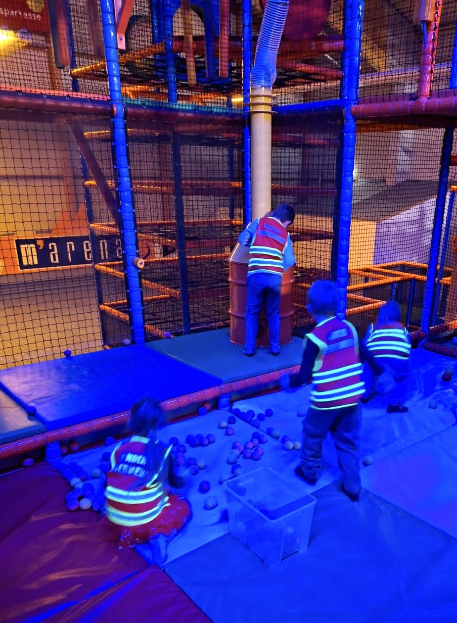 Als Überraschung hierfür, stand die Kids Arena in Marienberg bereit und wartete mit vielen tollen Attraktionen auf die Kinder. Zum letzten Treffen in diesem Jahr, durften sich hier alle noch einmal richtig austoben. Verschiedene Hüpfburgen konnten erklommen und der große Käfig durchkrabbelt werden. Man fuhr Rennen mit elektrischen Autos oder jagte mit Roller und Dreirad durch die Halle. Auch der Riesenrutsche sausten die Nachwuchsretter mehrmals hinunter. Aber auch die Jugendgruppenleiter kamen in dem großen Spieleparadies auf ihre Kosten.