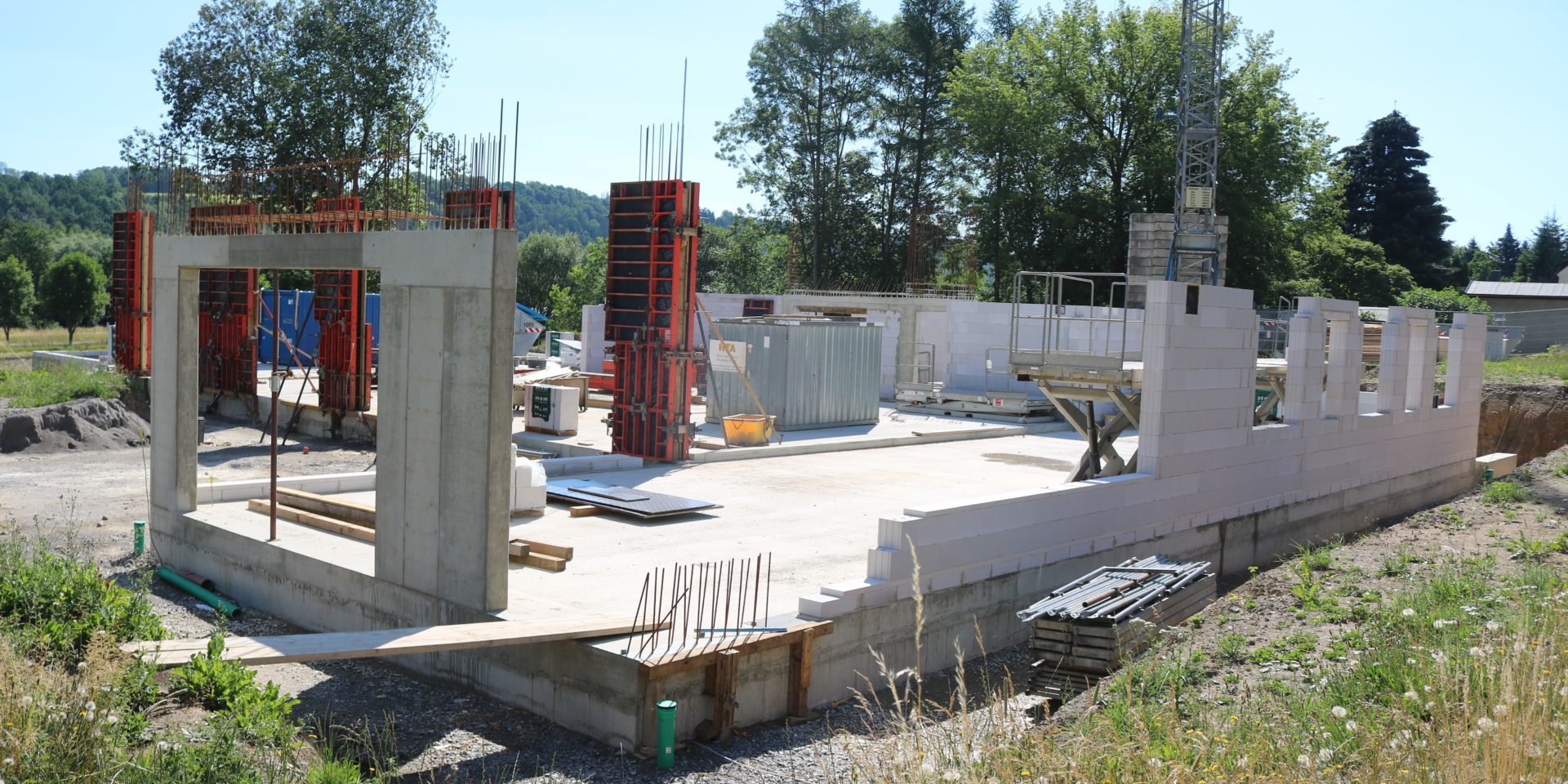 Da es in den zurückliegenden Wochen mit den Mauerarbeiten bei gutem Wetter zügig voran ging, konnten gegenwärtig schon das Erdgeschoss vom Sozialgebäude sowie große Teile der Fahrzeughalle fertiggestellt werden. Auch die angrenzende Halle der Wasserwehr nimmt nun Gestalt an.
