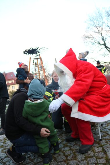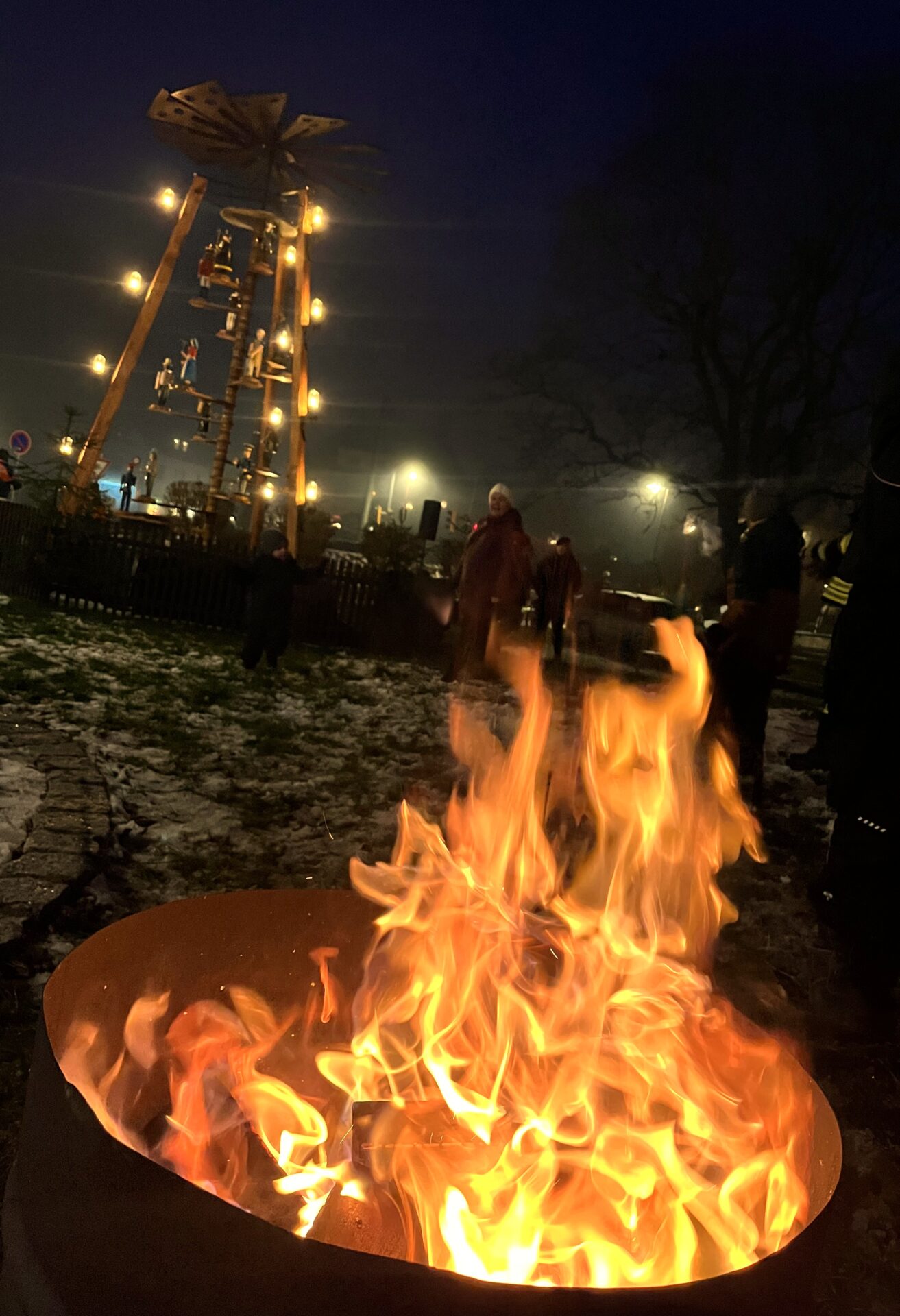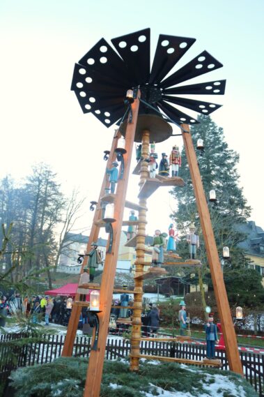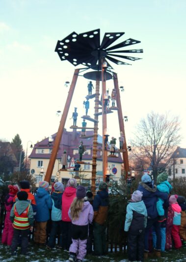 Am vergangenen Samstag, den 29. November, fand im Pockauer Kulturpark das 10. Pyramidenanschieben statt. Bei bestem Wetter, nur leider ohne Schnee, wurde in gemütlicher Atmosphäre gemeinsam mit vielen Mitbürgern und Gästen die Adventszeit eingeläutet. Nach der Begrüßungsrede durch den stellvertretenden Ortschaftsrat Steffen Haugk, folgte das Anschieben der Pyramide. Mit Hilfe aller Kinder, brachte man durch kräftiges Pusten die schöne Ortspyramide zum Drehen. Am Nachmittag schaute auch wieder der Weihnachtsmann vorbei. Ihn brachte man aufgrund Schneemangels jedoch wieder mit dem Feuerwehrauto von seinem Notlandeplatz zu dessen Einsatzort an die Pockauer Pyramide. Bei ihm stand man zahlreich Schlange, um die gelernten Lieder und Gedichte vortragen zu können. Neben Leckereien vom Grill, konnte man am Lagerfeuer wieder eifrig Knüppelkuchen backen, worauf viele Gäste positiv gestimmt waren. Die Beteiligung am Lampionumzug, welcher zum Adventssingen zur Kirche führte, war wieder groß. Anschließend ließ man den Abend in gemütlicher Runde im Kulturpark ausklingen.